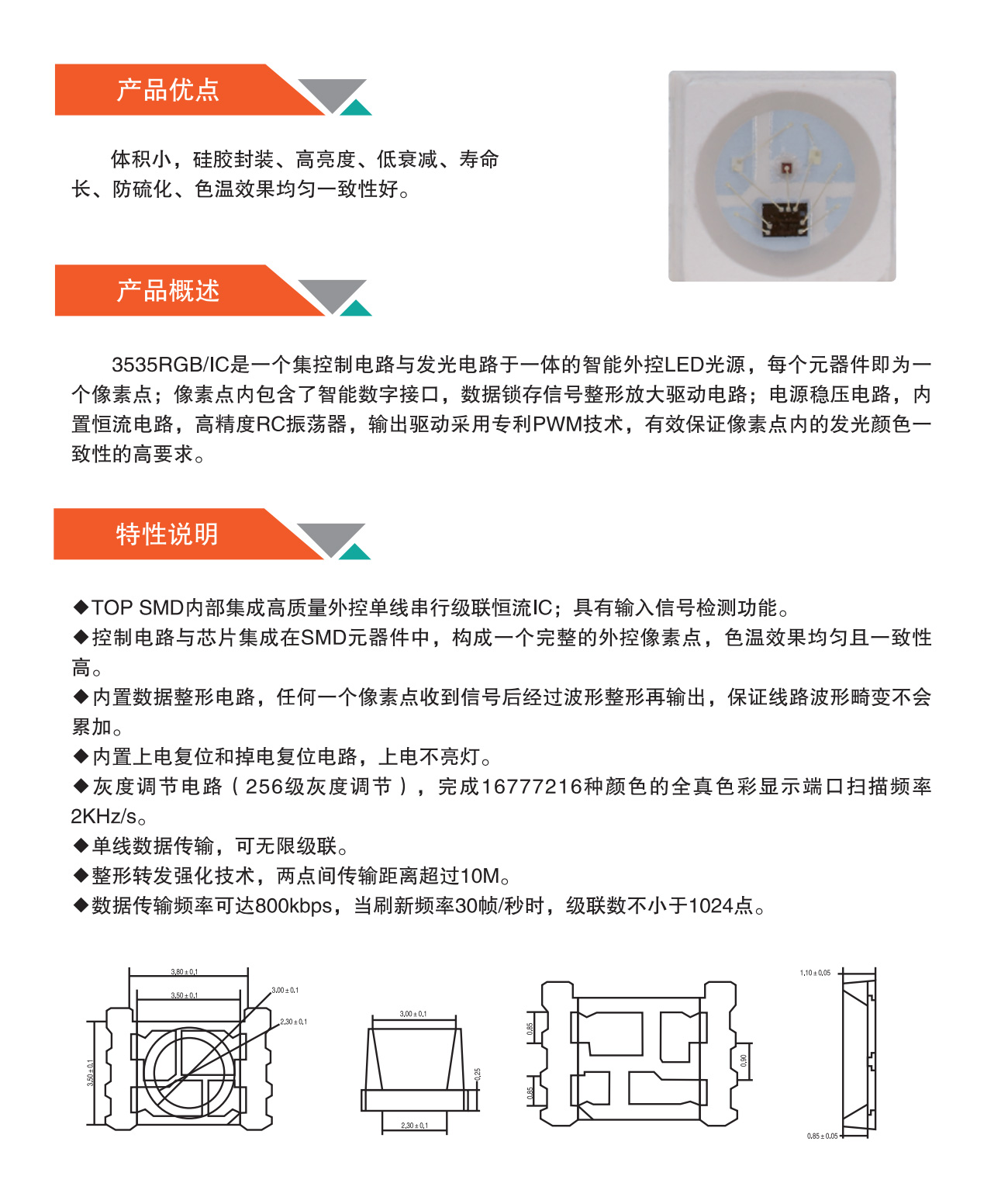 3535RGB/IC是一个集控制电路与发光电路于一体的智能外控LED光源,每个元器件即为一个像素点;像素点内包含了智能数字接口,数据锁存信号整形放大驱动电路;电源稳压电路,内置恒流电路,高精度RC振荡器,输出驱动采用专利PWM技术,有效保证像素点内的发光颜色一致性的高要求。